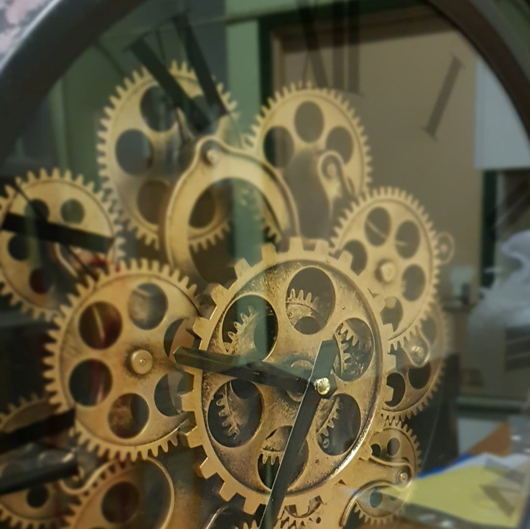- Exposed gears rotate to fuel the rhythm of the clock's slender black hands, leaving admirers mesmerized and in a hypnotic state as they watch the gears rotate in perfect unison.