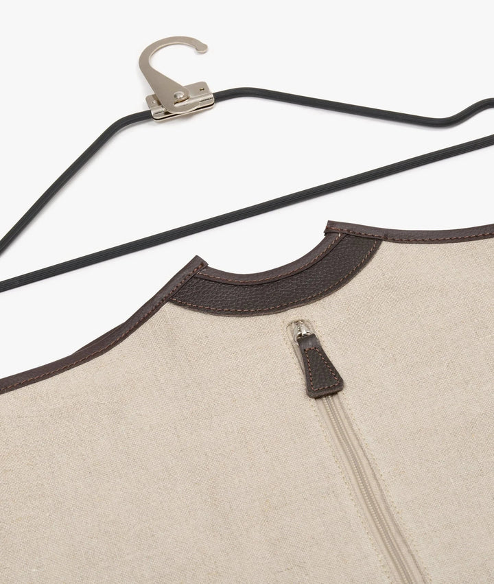 The My Style Bags Garment Bag in Dark Blue is perfect for both style and functionality. With a convenient cotton exterior and luxurious grained leather handle, this travel accessory is designed to keep your clothes safe and organized. It is also customizable and suitable for storing all types of garments and suits during your travels. The dark brown leather details and personalization options add a touch of sophistication. Pair it with ivory, dark brown, or burgundy embroidery for a stylish finish.