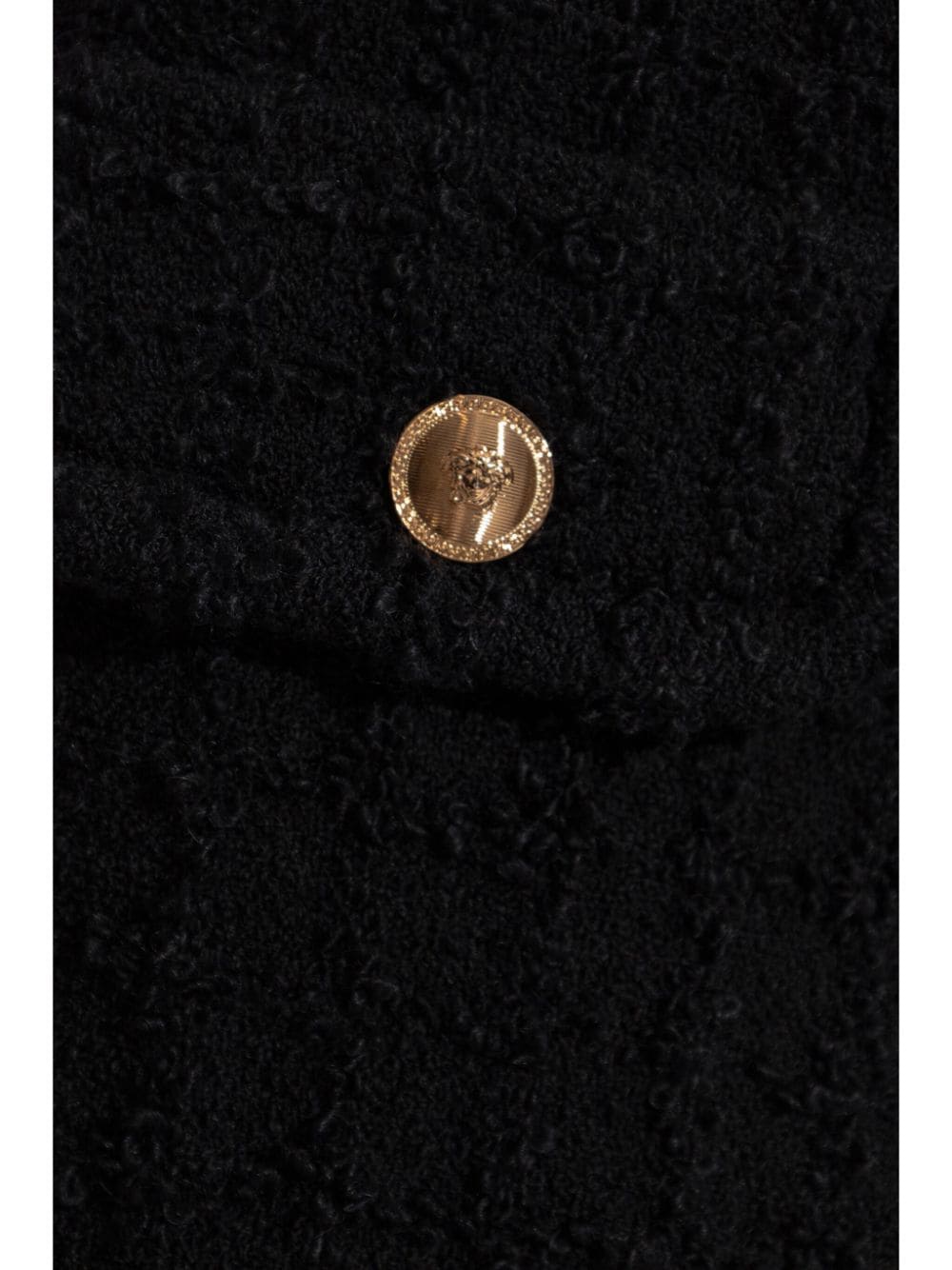 Black virgin wool blend tweed decorative button flap two side inset pockets embossed gold-tone buttons unlined concealed fly and button fastening thigh-length.