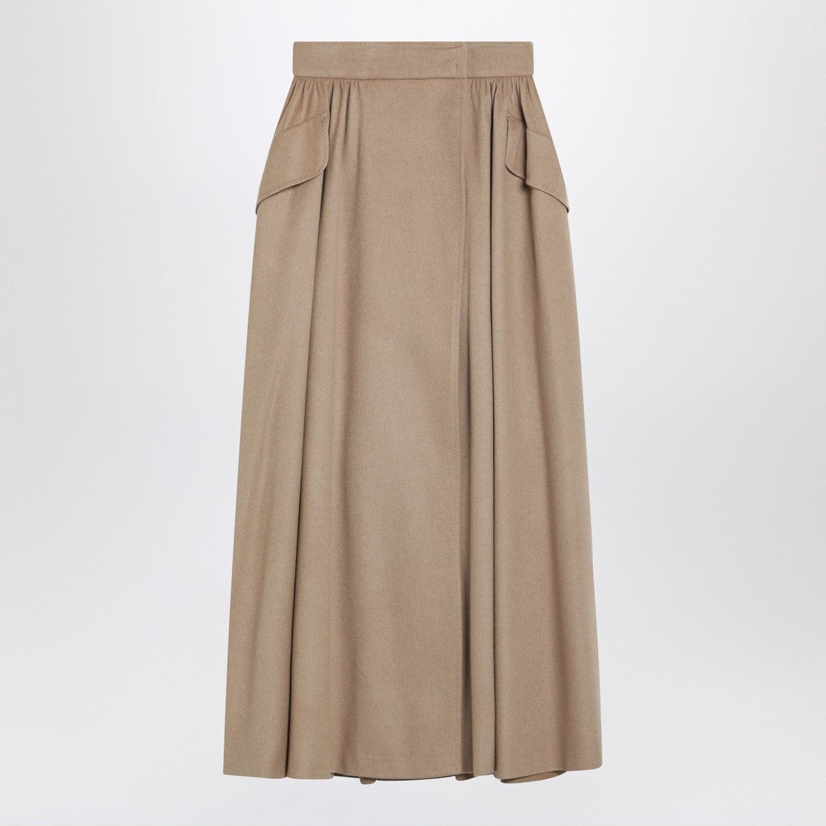 Midi skirt by Max Mara in beige zibeline camel lightweight drap, featuring wrap design, side pleats for volume, wide cut, back zip closure, side flap pockets, and asymmetric front cut.