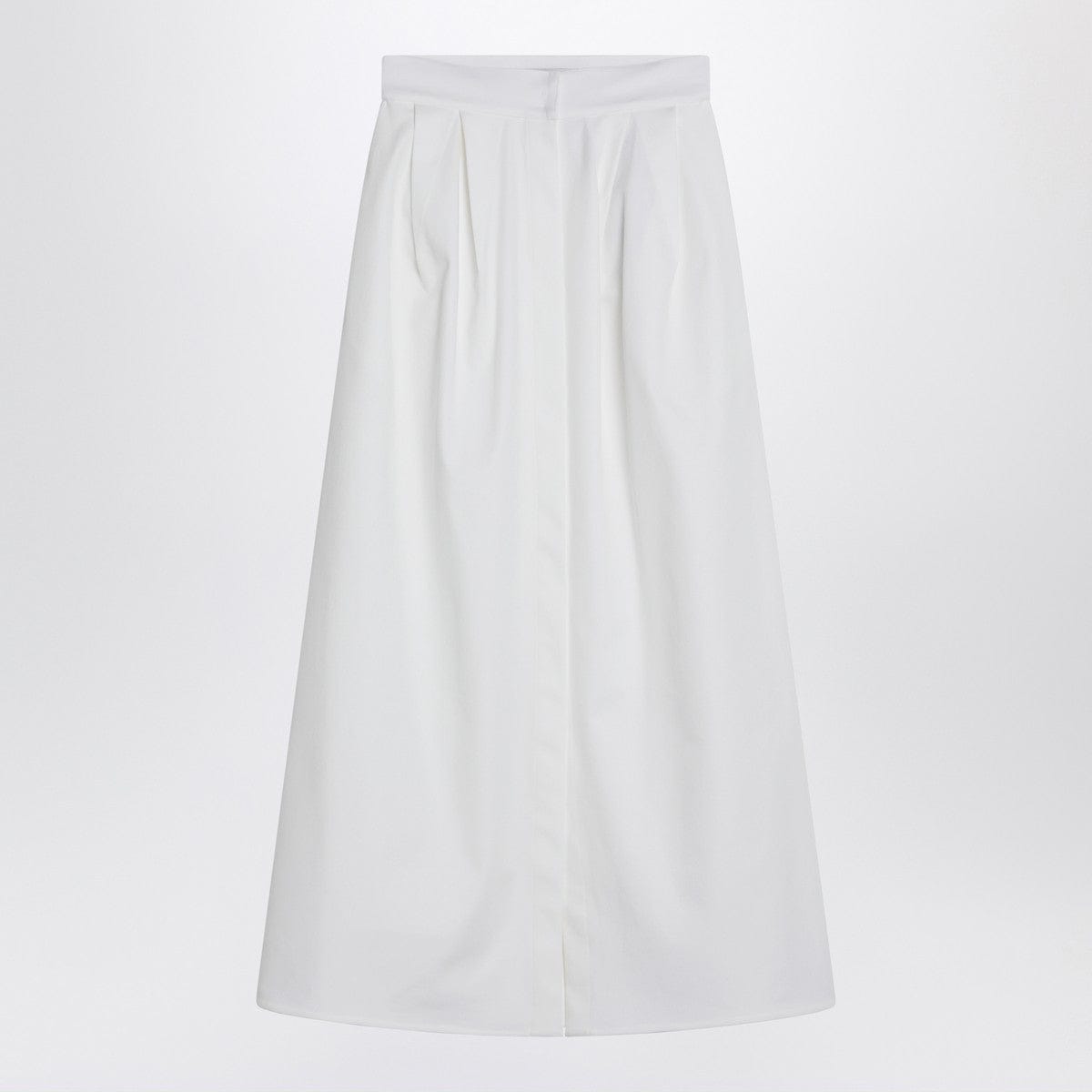 Long wide coat by Max Mara in white stretch cotton gabardine, characterized by a deep slit at the front, hidden button front closure, front pleats, and two side welt pockets.