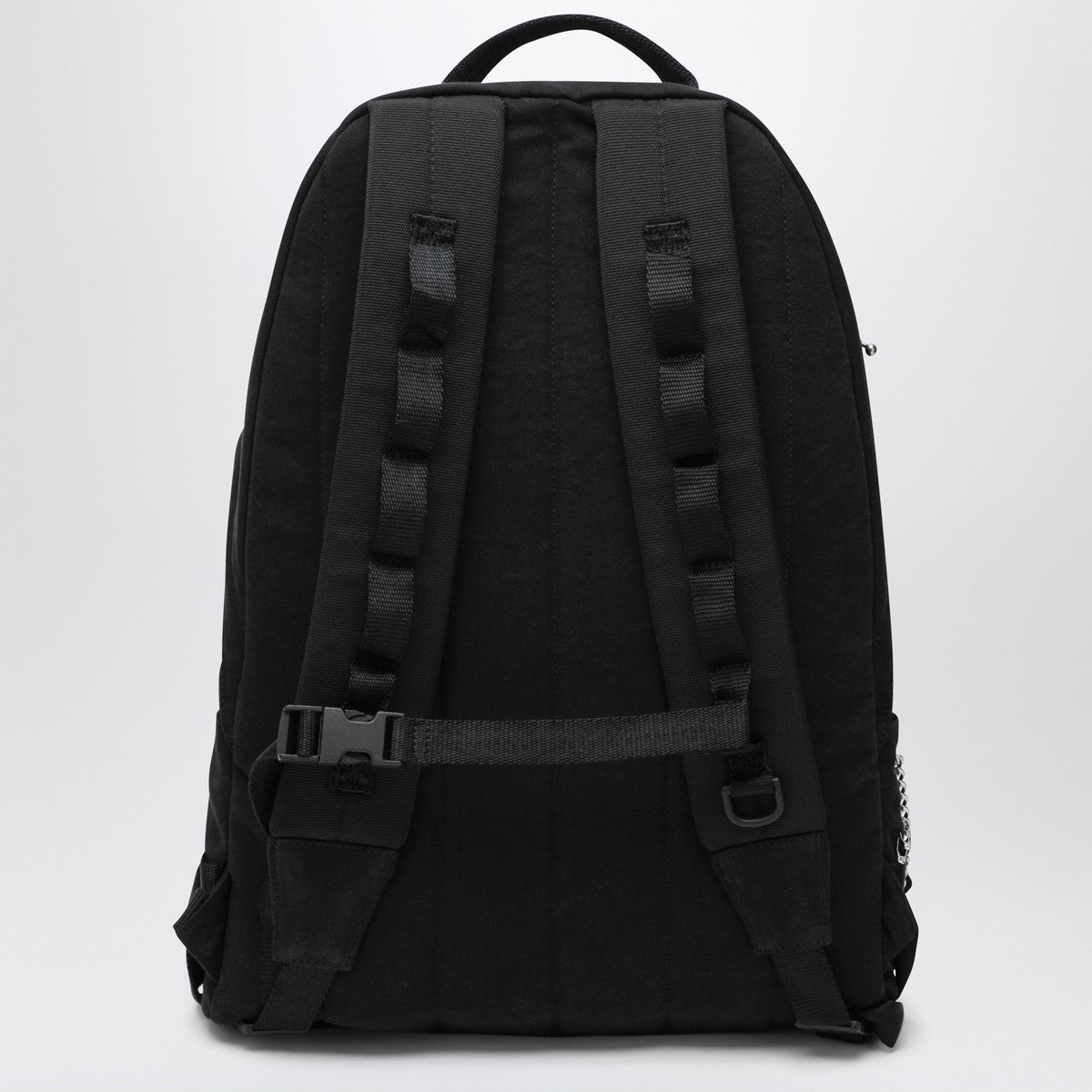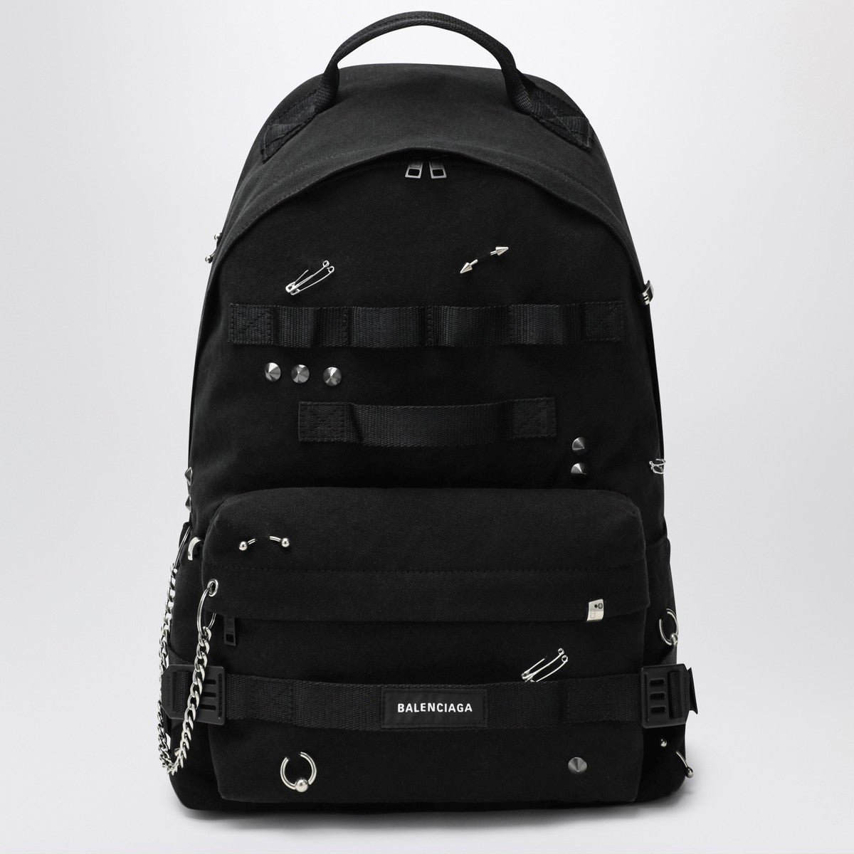 Medium backpack by Balenciaga in black fabric, featuring a top handle, adjustable shoulder straps, zip closure, front zip pocket, logo patch on the front, one flat internal pocket, chains, pins, and metal studs with a silver finish.