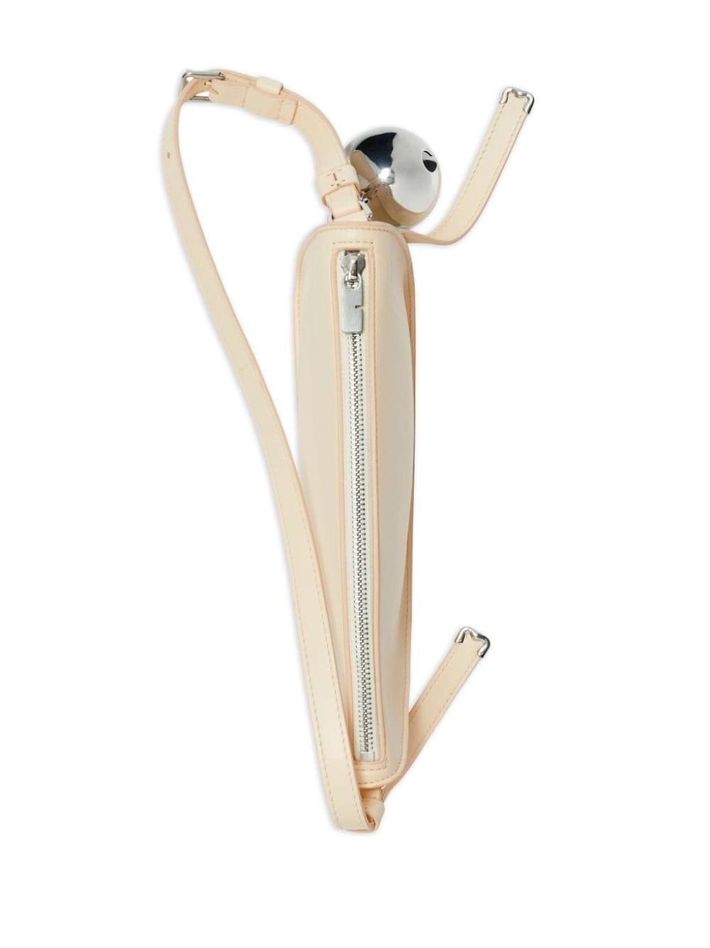 hellbeiges Lammleder, charakteristisches Rittermotiv, silberfarbene Metallteile, Glöckchenanhänger, Reißverschluss oben, verstellbarer Schultergurt, Hauptfach.